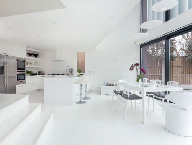 The open-plan ground floor is flooded with natural light thanks to full height glazing, which stretches across the entire side of this storey