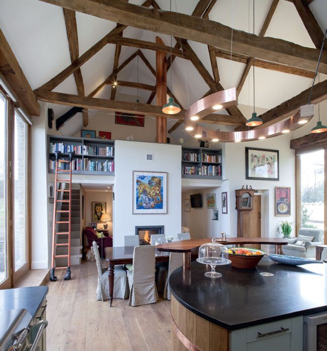 Maintaining the original character of this property was a top priority for the homeowners throughout their barn conversion project. The building is listed, so the works had to adhere to strict planning conditions stipulated by the local conservation officer. As such, the design team at Blake Architects developed a scheme that retains the original walls and roof of the dwelling, thus preserving its authentic agricultural style, while integrating new elements such as storey-height glazing to bathe the open-plan interiors with natural light. A mezzanine level was also incorporated in this central vaulted area to house the owners’ collection of books and paintings.