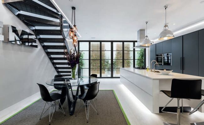 A lightwell that spans the entire width of this basement ensures the contemporary kitchen-diner is flooded with light. A staircase with open risers and an open balustrade enhances the flow of light on the subterranean level