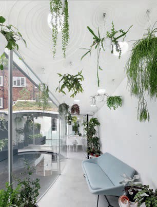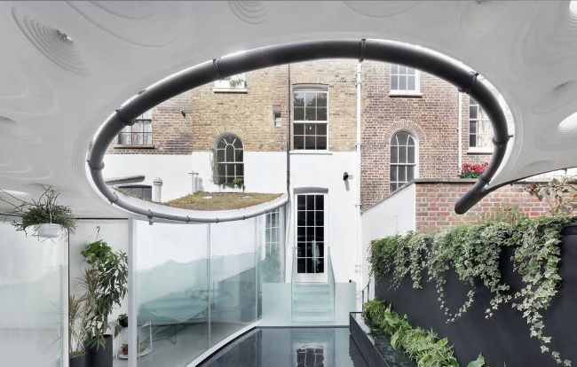 The sweeping curved plywood roof on this extension to a grade II listed Georgian townhouse is angled to follow the sun’s path throughout the day, and planted with greenery to blend into the garden. Rainwater is harvested in a tank and, at a touch of a button, floods the patio to transform it into a shallow pool. The additional space forms a living area and studio for the architect owners.