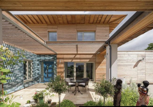 co.uk) supplied a timber frame package for this stylish modern home. It features multiple louvres and overhangs for shading, as well as a sheltered courtyard to enjoy the outdoors
