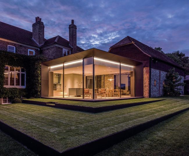 Gregory Phillips Architects (gregoryphillips. com) designed a contemporary extension for this Grade II listed farmhouse that suits open plan living, all while respecting the heritage of the existing property