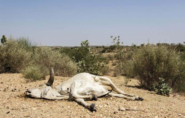 This cow is a victim of the ongoing drought in the Sindh Province and surrounding areas of Pakistan, where disease and hunger among humans are alarmingly high because of the lack of enough potable water. Up to 5 million people have been affected so far.