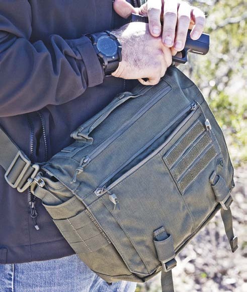 A sidearm readily fits and is easily drawn from the dedicated top-opening EDC pocket on the Summit Side Satchel.