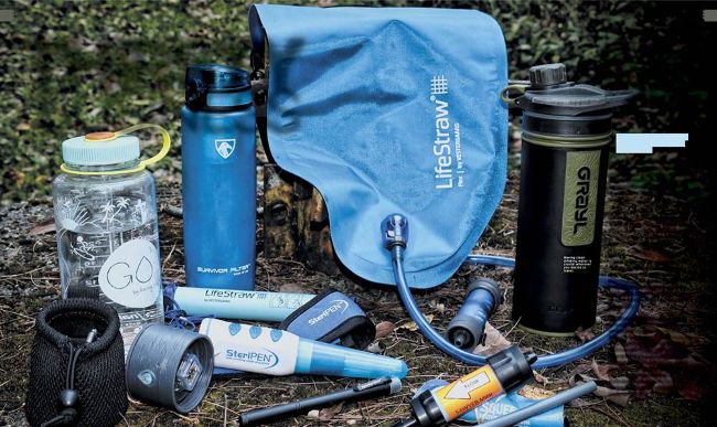 For carrying water when I’m on the move, often I’ll have one or more containers that might include a 1-quart, wide-mouth Nalgene bottle, military-style canteen, water bladder, or water bottle with integral fi lter, such as those from Survivor Filter or Lifestraw. I’ll use the water bottles with integral fi lters even when I’m staying in a hotel.