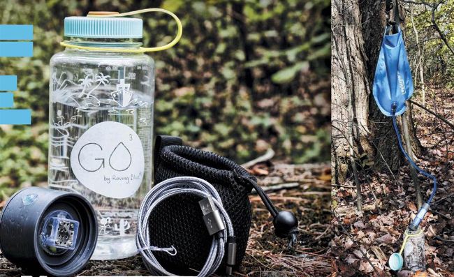 The Roving Blue GO3 rechargeable water bottle pod uses ozone generated by oxygen in the water to purify the water. It screws onto a wide-mouth Nalgene bottle.