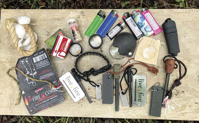 Even that paracord bracelet in the center of the photo has a mini ferro rod with a striker. (The author might be overcompensating for not yet mastering the skill of using a bow drill.)