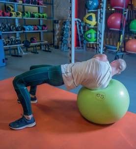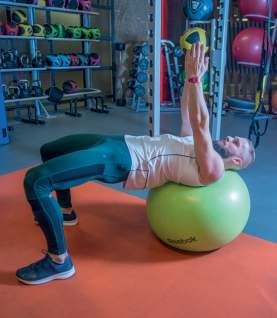 WITH your feet shoulderwidth apart, and a Swiss ball under your shoulders, create a line from knees to shoulders.
