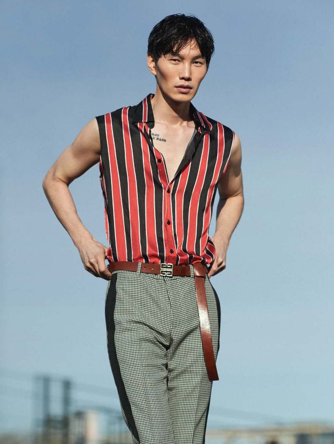 Wonil wears shirt, trousers and belt, all by Givenchy