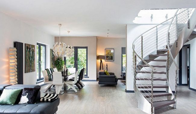 The large openplan living area has been cleverly zoned into ‘rooms’ by the strategic placement of furniture, a partition wall and a stunning steel helical staircase
