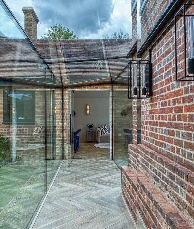 In this Kent project by IQ Glass, a frameless glazed link connects the original red-brick house with a new brick extension, and there is a nearinvisible slim-framed pivoting glass door on the threshold to the new kitchen-diner space. The same herringbone flooring is used throughout the building, including through the link, for a sense of continuity