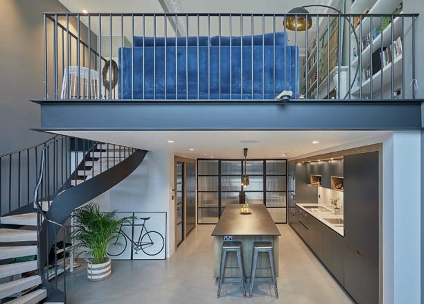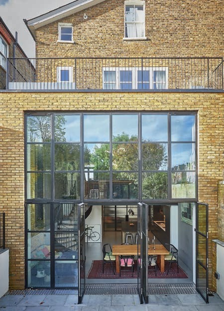 A doublestorey glazed extension by 3s Architects (3s-ad. com) has created a ground-floor kitchen with a cantilevered living area above, designed to allow light to penetrate into the lower level and provide a better connection between living spaces. The kitchen cost £90,000 from Kitchens By Holloways (kitchensby