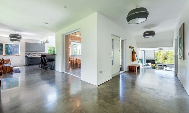Above: The front door opens into a generous space rather than a tight corridor, leading to the living room in one direction and the kitchen in the other.
