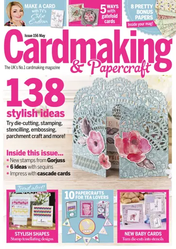 Our May issue is brimming with ideas! Turn your die-cuts into stencils to make a set of new baby cards, stamp colourful tessellating designs, discover six sparkling ideas with sequins, make a beautiful butterfly card with Chloe Endean, impress your loved ones with cascade cards, enjoy parchment craft with Barbara Gray and more!