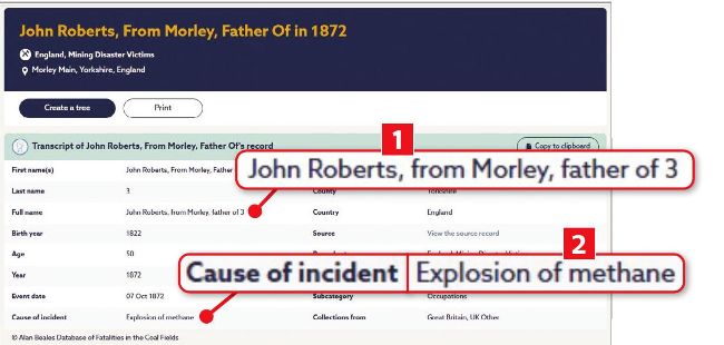 Findmypast tells us that John Roberts died in a methane gas explosion at Morley Main Colliery in 1872