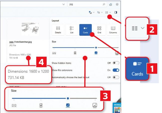 Open a folder in Files then click the Layout icon ( 1 in our screenshot) followed by Cards 2 . Now move the slider 3 to decide how big you want the cards to appear. Images show the dimension 4 , while videos show the length.