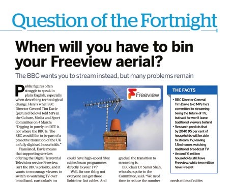 I hope I’m never forced to get rid of my Freeview aerial (‘Question of the Fortnight’, Issue 706, pictured). I’ve always regarded aerials as freedom and streaming as tyranny. A bit dramatic? I don’t think so. With an aerial you have a no-stringsattached way to access a wide range of TV channels.