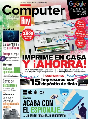 Computer Hoy 656 Imprime en casa y ahorra: los costes de impresión pueden ser cosa del pasado con las impresoras con depósito de tinta recargable. También recordamos en cifras 25 hitos de Google, te explicamos cómo acabar con el espionaje en tus dispositivos y te ofrecemos trucos para Windows.