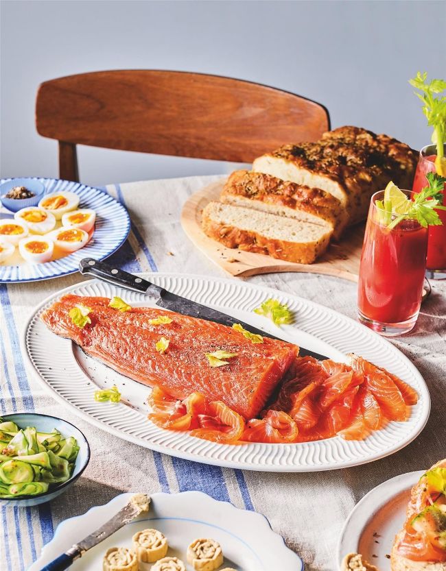 What a spread! The salmon is cured using flavours taken from the classic brunch cocktail, bloody mary: celery seeds, black pepper, lemon zest, horseradish and vodka. It’s then served with tangy Tabasco pickles and creamy soft-boiled eggs with dipping salt, plus Worcestershire sauce butter for spreading on good bread