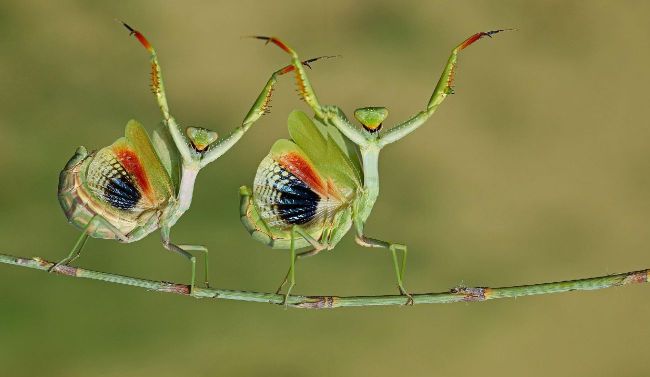 “I spotted the praying mantises on a branch and moved closer to get a better look. When I tried to touch them, they attacked by spreading their wings and began to follow me. I didn’t want to miss it, so I quickly started taking pictures. I’m not familiar with the behaviour of praying mantises and had never seen this pose before – I could hardly believe my eyes. I was excited and my hands were shaking as I took the photos. I think this is a miracle of nature – to me, they look like smiling dancers. I hope it inspires others to enjoy the beauty of wildlife photography.”