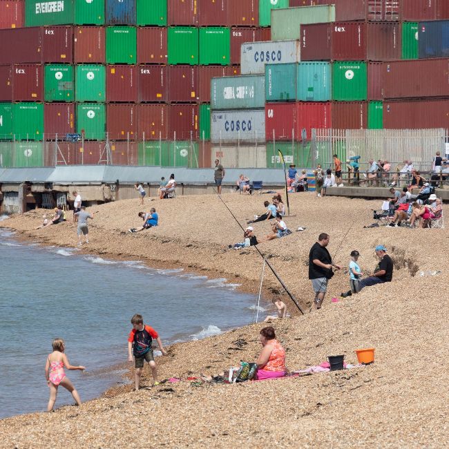 Package Holiday. With the lockdown lifted but foreign travel still restricted, the sunny weather draws the crowds near Felixstowe Port. I cropped into the containers with a 300mm telephoto lens, so they look like a pixellated sky that is easy to imagine continuing infinitely. I felt the snapshot aesthetic of the beach scene, and all the different social groupings within that, contrast effectively with the structured geometry of the port behind.