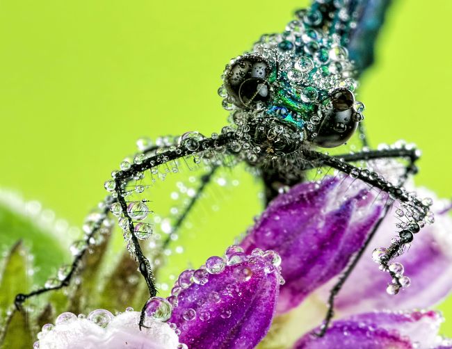 Capturing some of the water droplets and eyes as sharp as possible helps this damselfly stand out from the backdrop.