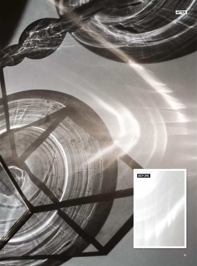 You don’t need a studio setup to achieve abstract photo art – simply use the harsh midday sun and set up the scene in front of a window. This makes it more difficult to control the shadows, but you can adapt your setup to the available light.