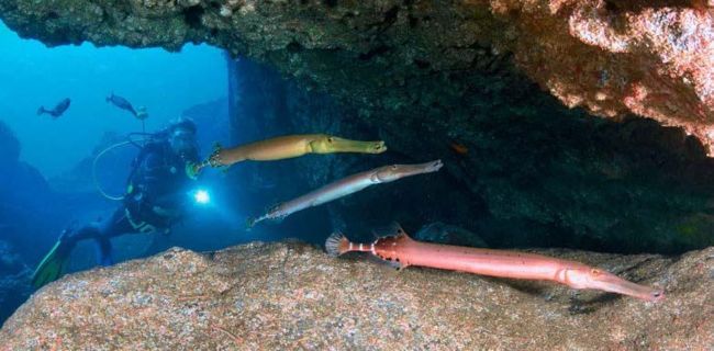 Multi-coloured trumpetfish in the Blue Hole cavern.