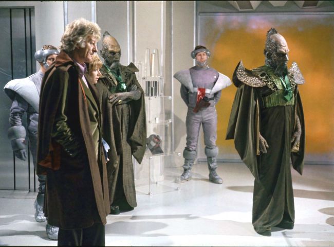 Prior to his premature death in 1979, writer Malcom Hulke (right) admitted that Frontier in Space was “a very political idea really” – with a cold war between the future empires of Earth and Draconia in danger of turning hot. “The two sides as far as I was concerned were the Soviet Union and America and somebody else trying to tickle ’em up and get them at war with each other when they were quite capable of living at peace.” The name of the reptilian Draconians wasn’t derived from ‘dragons’ but from classical history – after a term used to describe the notoriously harsh penal code of Draco, a 7th-century BC Athenian legislator. Director Paul Bernard, a former designer, first sketched out the Draconians’ look –among other aspects. “I decided the manner in which they spoke – that they would have a lizard-like hiss,” he told the fanzine DWB in 1993, “and that they’d have the scales, and had to look sharp and intellectual…” The creatures’ half-masks were subsequently realised by sculptor John Friedlander. Jon Pertwee later professed himself “extremely pleased with the Draconians, who were the most beautiful pieces of work…”