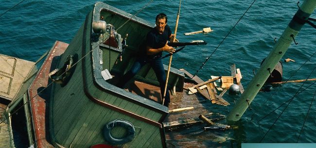 Chief Brody (Roy Scheider) is on the lookout as the Orca sinks.