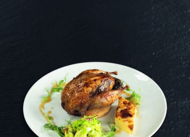 8. Serve the bird sitting on a piece of fried bread, with the gravy drizzled round, accompanied with dauphinoise potatoes and steamed shredded Savoy cabbage