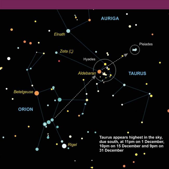 Its primary star is the red-giant Aldebaran, the 14th brightest star in the night sky. Extend the line of Orion’s belt up and right from the UK and Aldebaran is the first bright star you meet, its orange hue being very obvious.