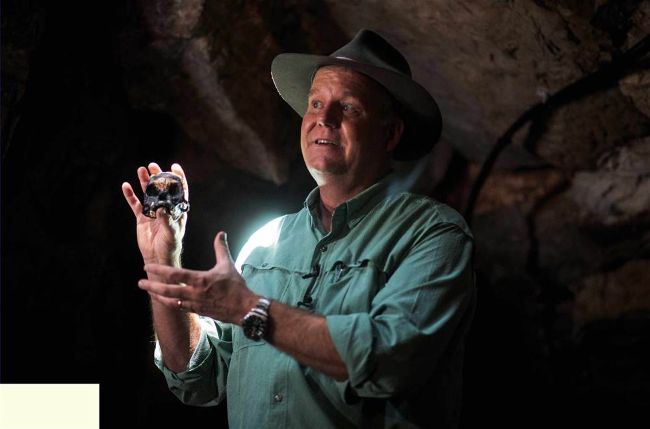 Prof Lee Berger with a life-sized reconstruction of the skull of Leti, a Homo naledi child