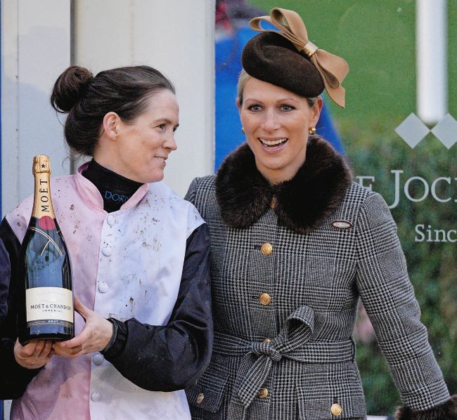 Proud mum Zara Tindall makes a chic arrival, protected from the chill in an LK Bennett coat, to present the prizes. Rachael Blackmore was delighted to take her prize (right) from Zara after her victory on Bob Olinger (above right)