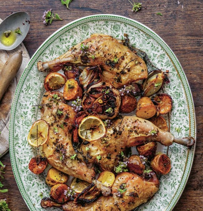1. The day before you plan to serve this dish, remove the chicken legs from the fridge and pat dry. Generously season with salt, scatter over some of the lemon thyme and oregano, then drizzle with a good glug of olive oil and massage the meat well. Place the dish back in the fridge and leave overnight to marinate.