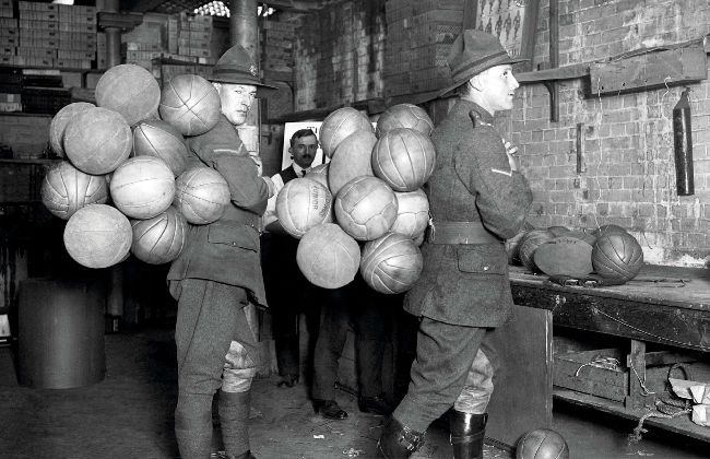 Life in the trenches was not one of constant combat, but intermittent bursts of fighting punctuated by long periods of waiting. Officers needed a way to maintain morale, stave off boredom and keep their men fit, and football matches – played behind the front lines, of course – were amongst the answers. The Australian and New Zealand Army Corps had already sent more than 3,000 balls to the front from this warehouse when this photo was taken in October 1916.