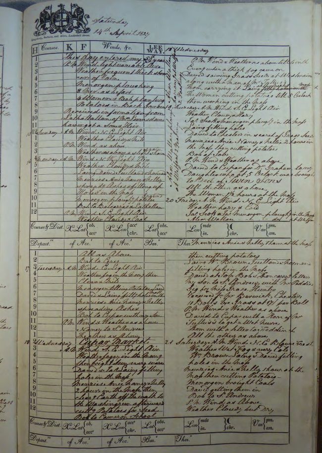 Photograph of a page from the Greigston diary, 14 - 21 April 1827