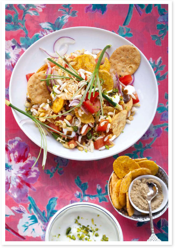 * 15g puffed rice * 4 tbsp gram flour noodles * 200g canned chickpeas, drained and roughly chopped * 4 medium vine tomatoes, diced * 1 red onion, finely sliced * 2 spring onions, finely sliced * 1-2 tsp chaat masala powder * ½-1 tsp ground cumin * fine salt, to taste * 2 tbsp tamarind sauce * 2 tbsp ground coriander