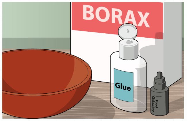 You will need borax, PVA glue, food colouring, warm water and two bowls. In countries where you can’t buy borax, you can use contact lens solution and baking soda instead.