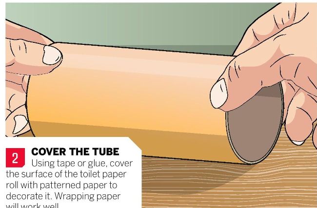 Using tape or glue, cover the surface of the toilet paper roll with patterned paper to decorate it. Wrapping paper will work well.
