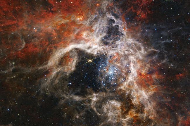 Crawling through the sky is a 340-lightyear-wide star-forming region called the Tarantula Nebula, part of the Large Magellanic Cloud. In 2022, the James Webb Space Telescope created this mosaic image using its Near-Infrared Camera. The dusty filaments of cosmic dust and gas give this nebula its eightlegged nickname, with its most active star-forming region found at its core.