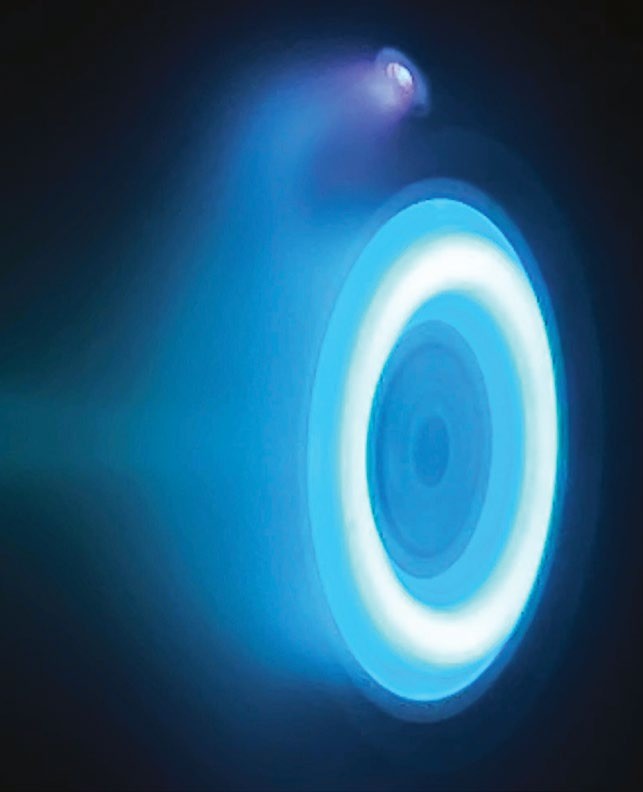 NEXT is a solar-electric engine, commonly known as an ‘ion engine’. Like all engines of this type, it uses electricity harvested by solar cells to ionise atoms of a propellant – in this case the unreactive gas xenon. The ionisation process uses a strong electric field to strip away electrons from the xenon atoms, leaving them with an overall positive charge. The electrons are then expelled from the thruster by repulsion from a positively charged ‘accelerator grid’. As gas escapes from the rear, the thruster is pushed forward by a balancing force. The forces involved are tiny compared to those produced in conventional rockets, but the process is extremely efficient and the thrust can be sustained for years rather than minutes.