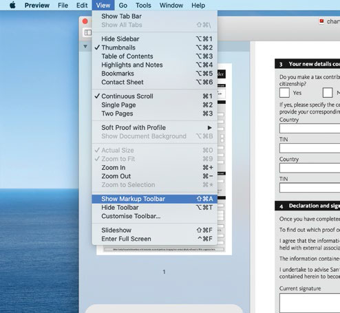 Make sure that your Mac and iPhone are signed into the same Apple ID and on the same Wi-Fi network, then open a doc in Preview and then click on View>Show Markup Toolbar.