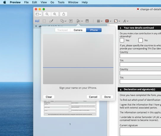 Now click on the signature icon in the toolbar and a drop-down window will appear, showing options to use your Trackpad, Camera or iPhone, click on the ‘iPhone’ option and your device will come to life.