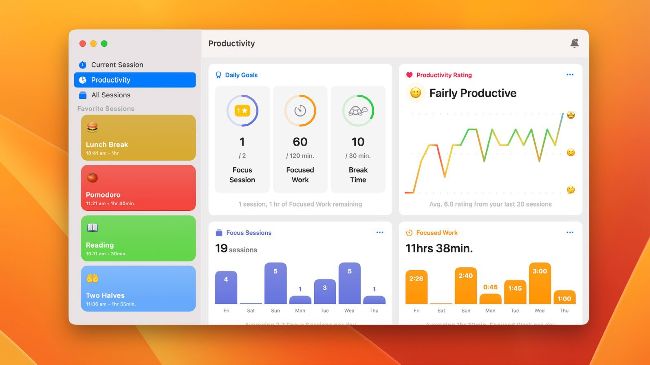 Running on your Mac but also syncing to iOS versions of the app via iCloud, this app doesn’t restrict your screen to show just the app you’re working on, as you may expect. Rather it’s a sort of advanced scheduler that notifies you and runs actions at predetermined times. You start by creating a session and within that, adding blocks of time that can be assigned to either work, break or planning. Within a session, you can also add different kinds of actions, such as running shortcuts when work or break times start or end, sending yourself reminders and triggering macOS Focus states.
