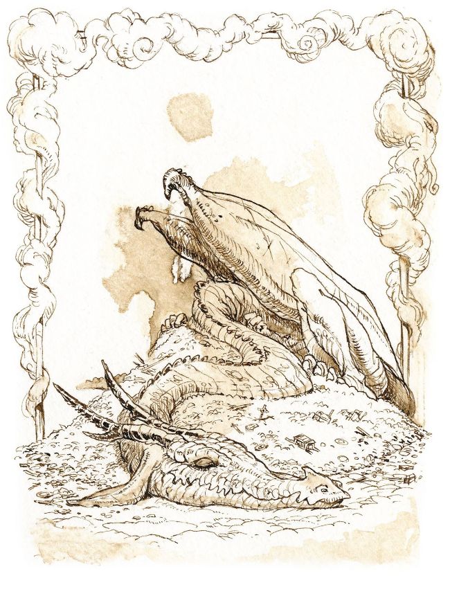 RELAX “One of my favourite Inktober drawings, done with walnut ink using a nib. For once, the dragon is not burning down a city or munching on some brave knight, it’s just resting, and illustrating the prompt of the day. I had a lot of fun framing the drawing with the dragon’s smoke swirls.”