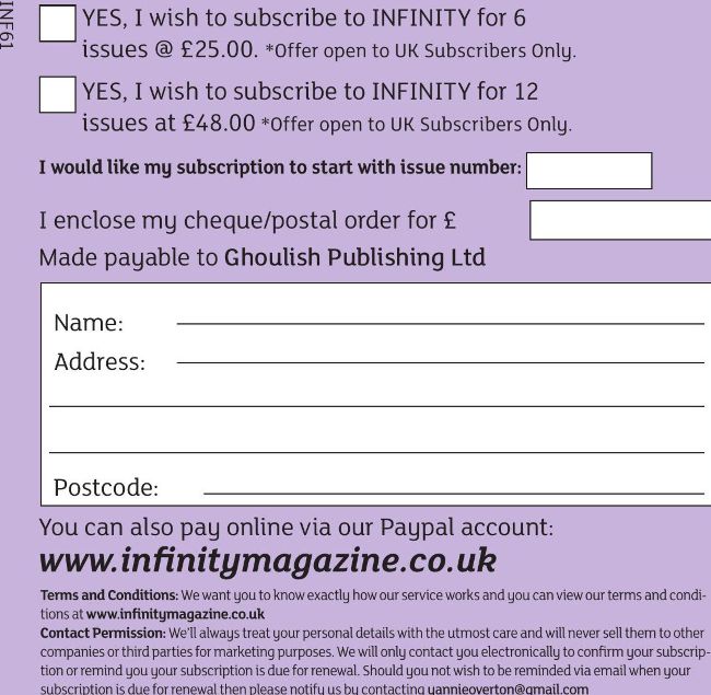 We hope you enjoyed this great issue of INFINITY, the superb science-fiction and nostalgia magazine for the discerning reader. Every issue is packed with amazing features on your favourite sci-fi movies and television shows, with extensive episode guides and fascinating behind-the-scenes information. INFINITY is different from the rest of today’s science-fiction mags in that it caters to the older reader as well as the young sci-fi fan, and you can expect the finest of genre journalism within its pages. INFINITY is now on sale every four weeks in most major newsagents, so it will be easy enough for you to find, but why not save yourself the shoe leather every month and get your copy of the magazine delivered to your door a few days before it even officially goes on sale? Better than that, if you take a subscription you will also save money too, because a 12-issue sub gets you £9 off -THAT’S 2 FREE ISSUES!