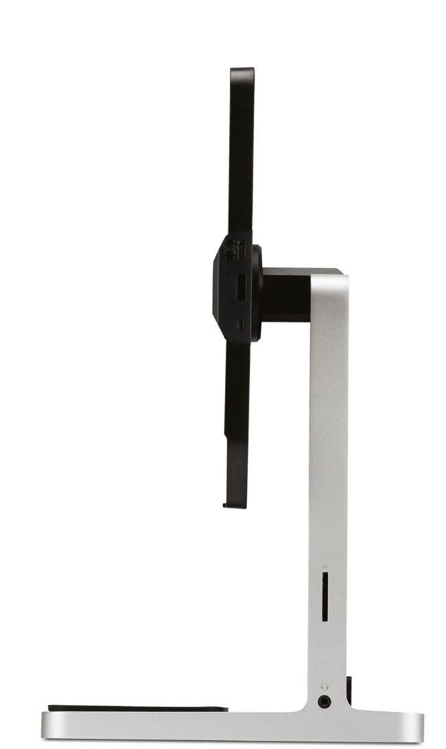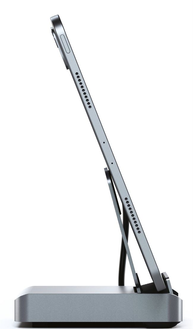 Finished in aluminium, the heavy base means there’s no danger of tipping over. iPhone and AirPod charging pads are found here too, with ports on the rear and sides. An Apple Watch charger can be clipped to the side, where a static USB–C plug powers your iPad.