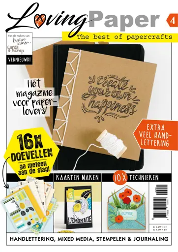 In deze uitgave van Loving Paper 4 gaan we aan de slag met het blenden van kleuren, een Mixed Media flessenlabel, boekbinden, een gift-envelop met gehandletterd kaartje en nog veel meer papiertechnieken.