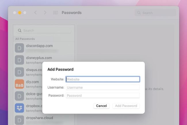 Click the menu and select System Preferences. Choose the Passwords pane and authenticate. Click the ‘+’ under the sidebar. Fill in the details for the website address, username and click Add Password.